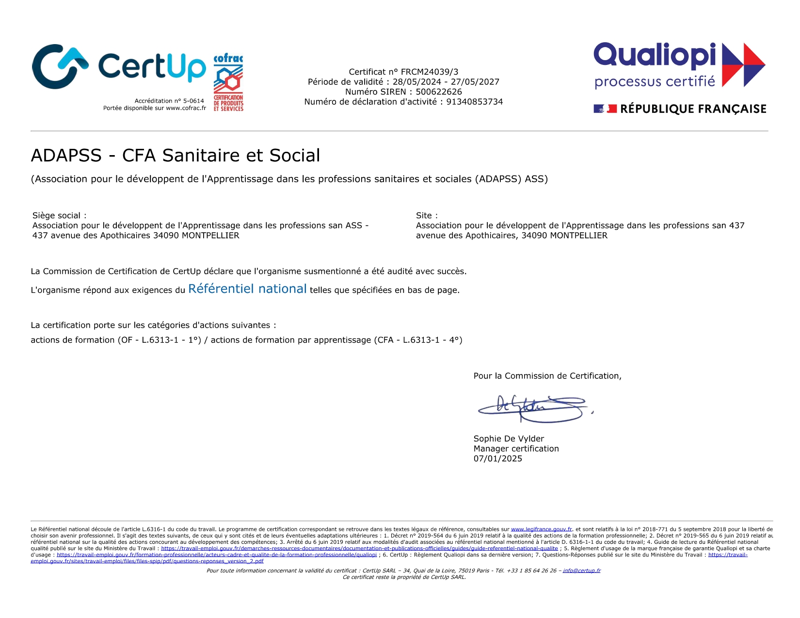 Le CFA sanitaire, social et médico-social est géré par une association : l’ADAPSS. Association pour le développement de l’apprentissage dans les professions sanitaires, sociales et médico-sociales, à but non lucratif, en Occitanie.